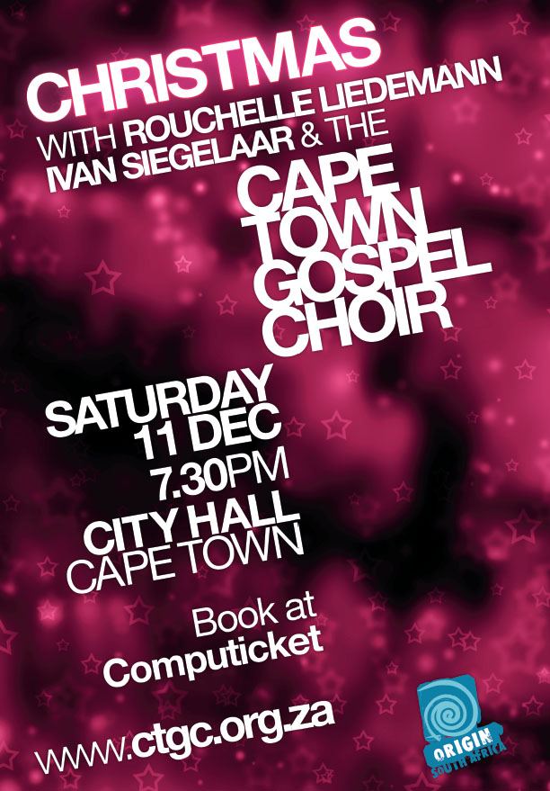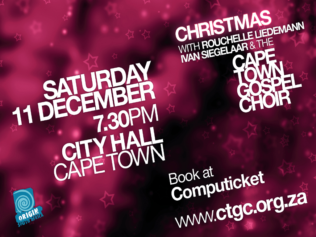 The Cape Town Gospel Choir will have their much anticipated launch event on Saturday 11 December 2010 at 19h30 in the Cape Town City Hall. Local Gospel favorites Rouchelle Liedemann and Ivan Siegelaar will light up the evening when they join with the choir as guest performers. The stage will be filled with the exuberant sounds of Christmas, from traditional old favourites to brand new Christmas music from artists around the world. The Origin Praise Choir and Woodbridge Primary School’s Children’s Choir will join the celebration and bring a smile to your face. The Exile Chamber Orchestra conducted by Colin Peckham, along with the Exile band, promise to get your feet tapping as your heart is stirred to sing along with some of your favourite Christmas carols. Bring friends and family for an unforgettable evening as we bring unity and transformation with the true meaning of Christmas.