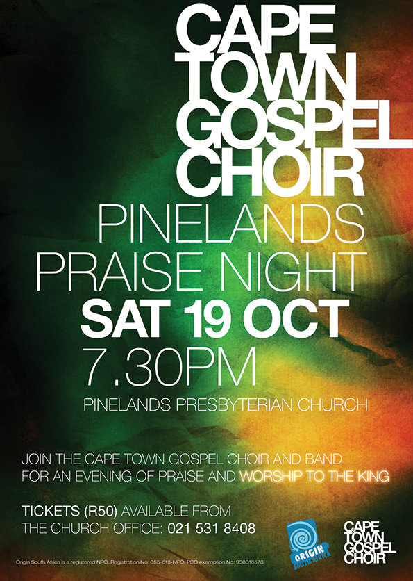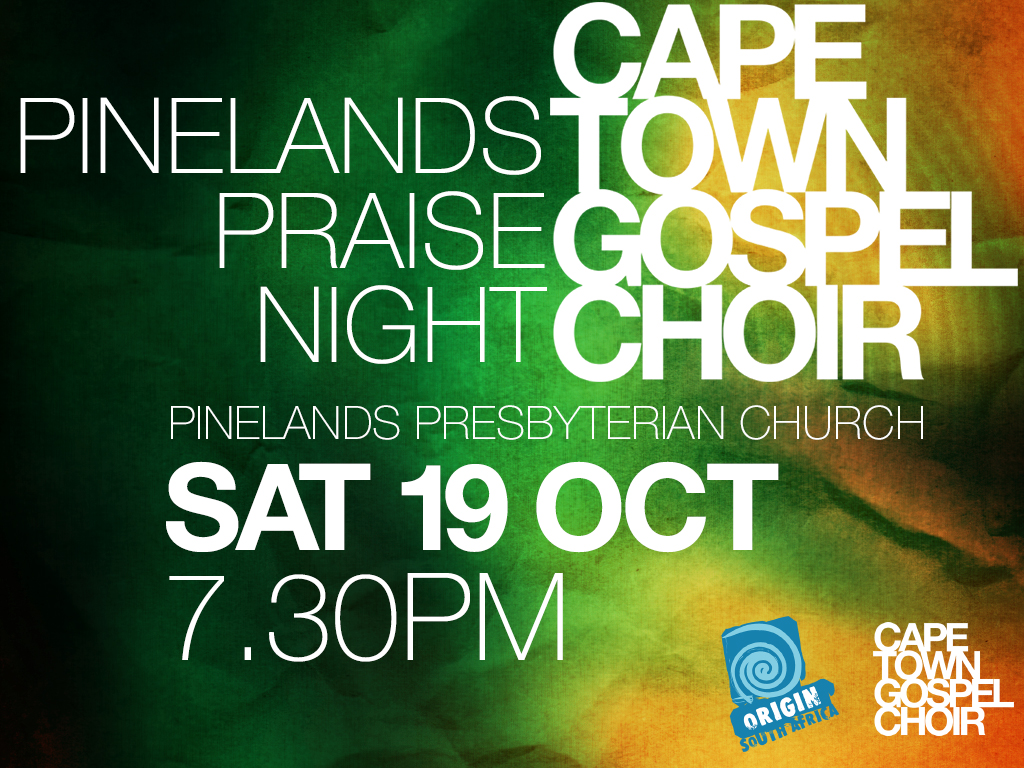 Join the Cape Town Gospel Choir for an 'unplugged' evening of worship both congregational and performance. The evening will also be a fundraiser for Pinelands Presbyterian Church.