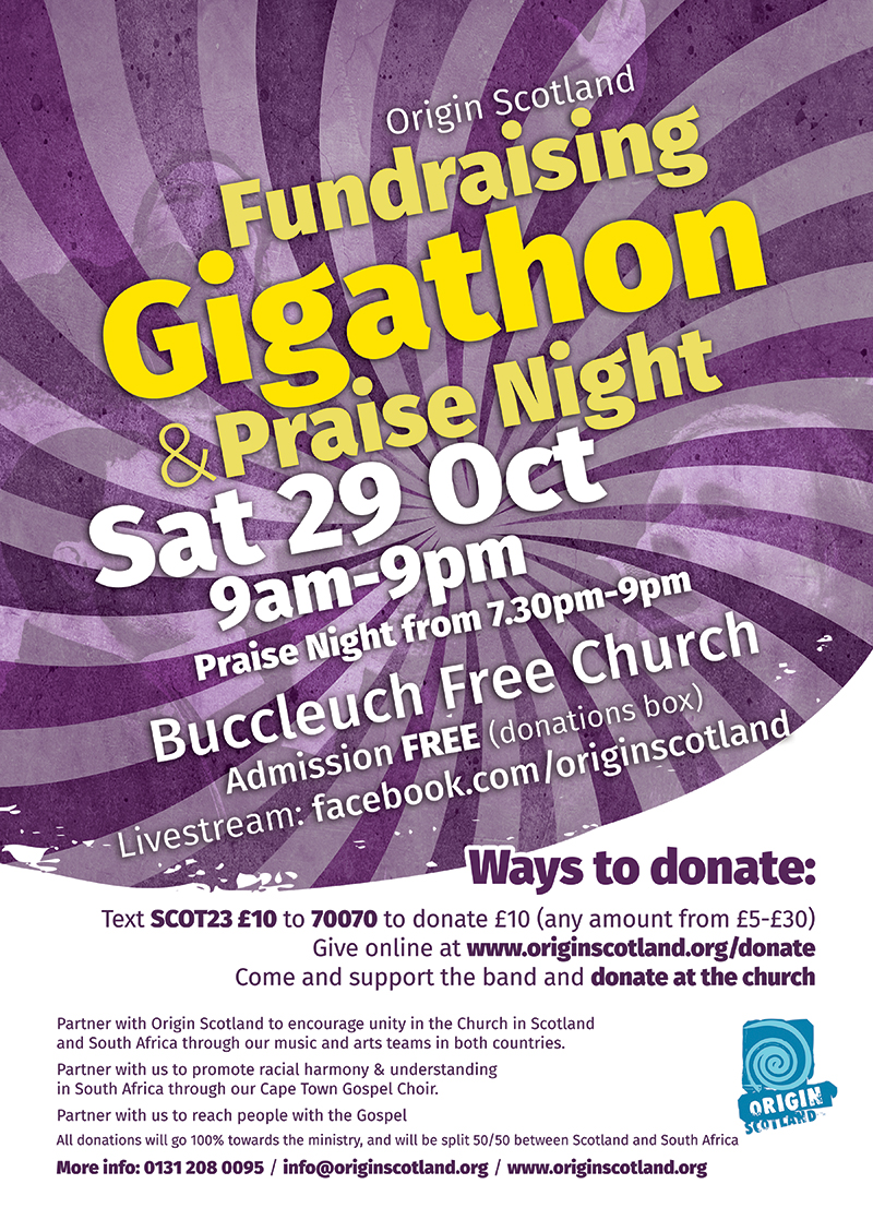 Join us for a 12-hour fundraising GIGATHON! The Origin band and singers (and maybe some surprise guests) will be gigging the day away to raise funds to enable our ministry to encourage unity in the church, and reach people for Jesus. We also work to promote racial harmony in South Africa. Partner with us to do it!