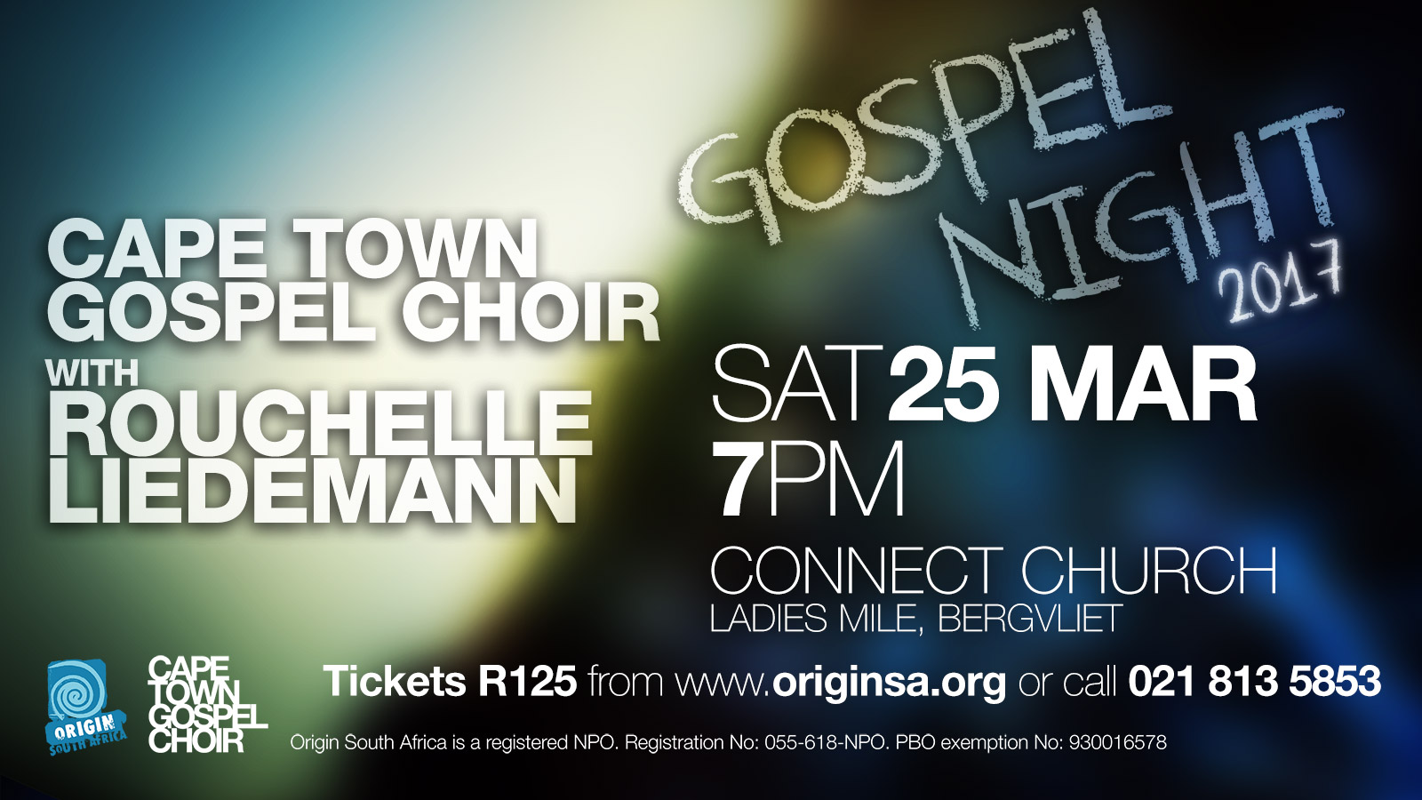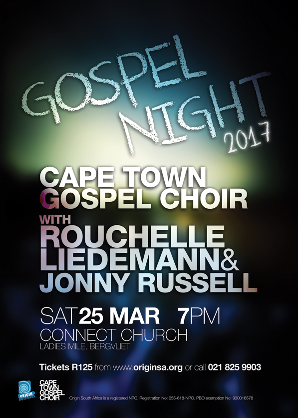 The choir is joined by Rouchelle Liedemann, outstanding local Gospel artist, TV and radio presenter, and introducing Jonny Russell from Scotland, one of Origin Scotland's lead soloists and fantastic Gospel performer.