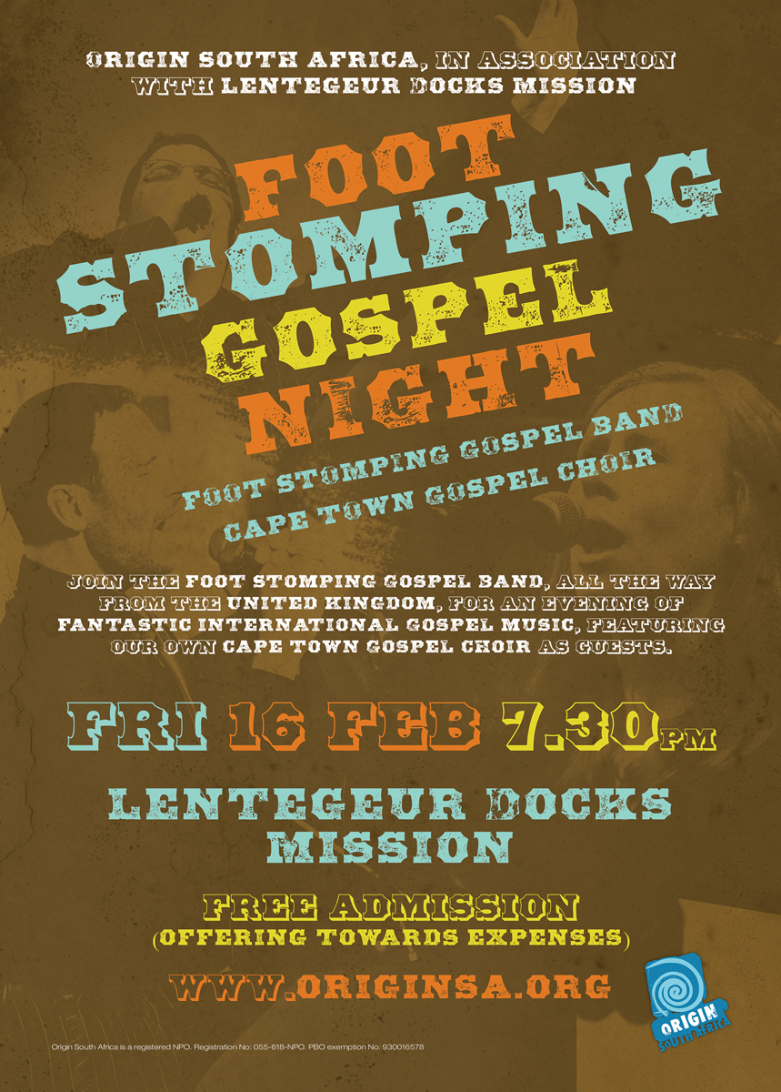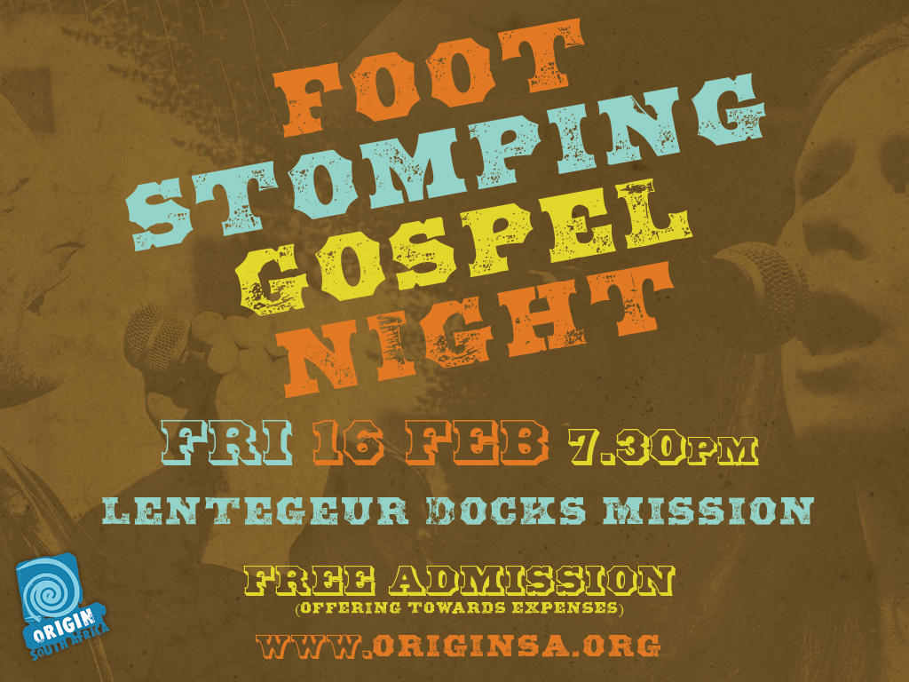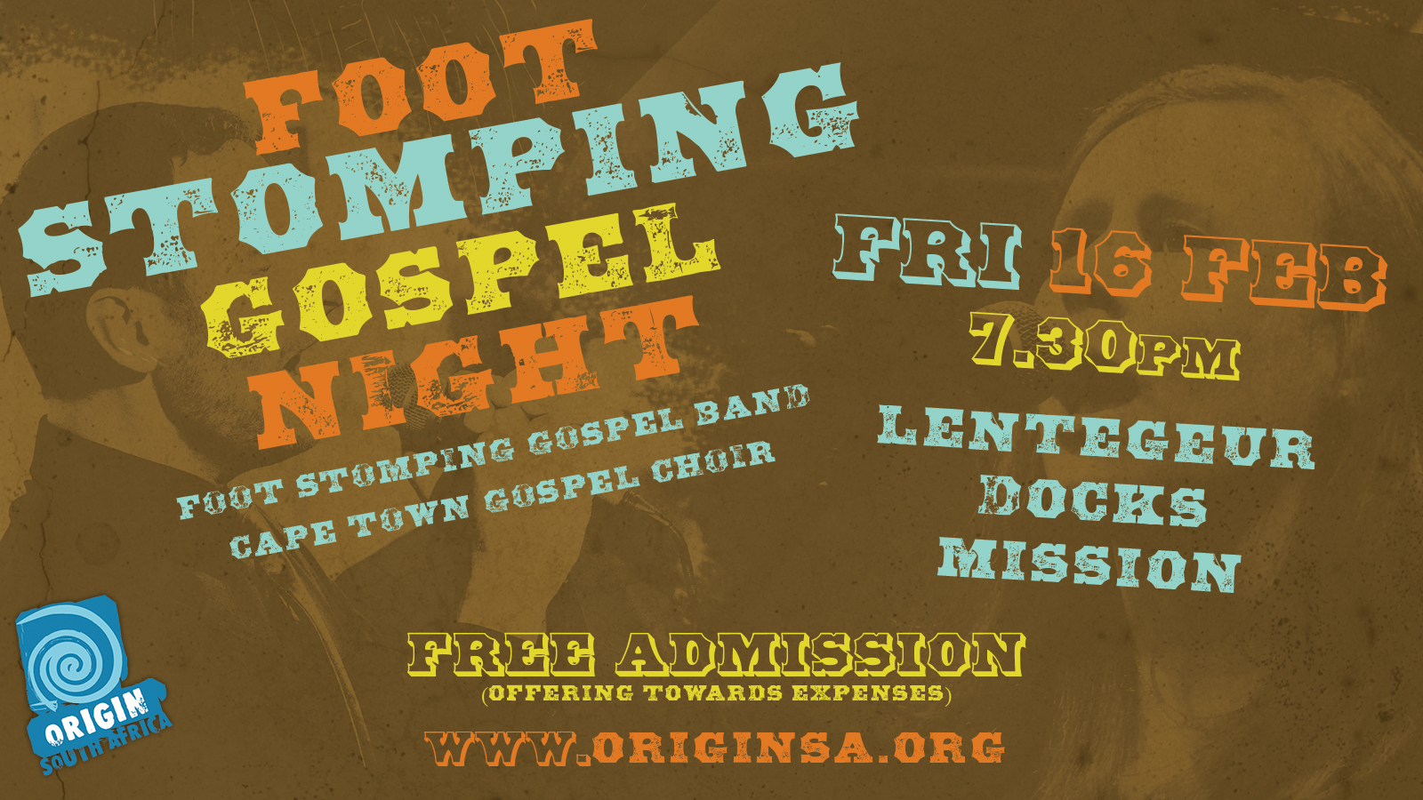 The UK's Foot Stomping Gospel Band presents an evening of Foot Stomping Gospel, along with local artists, the Cape Town Gospel Choir, and local musicians.